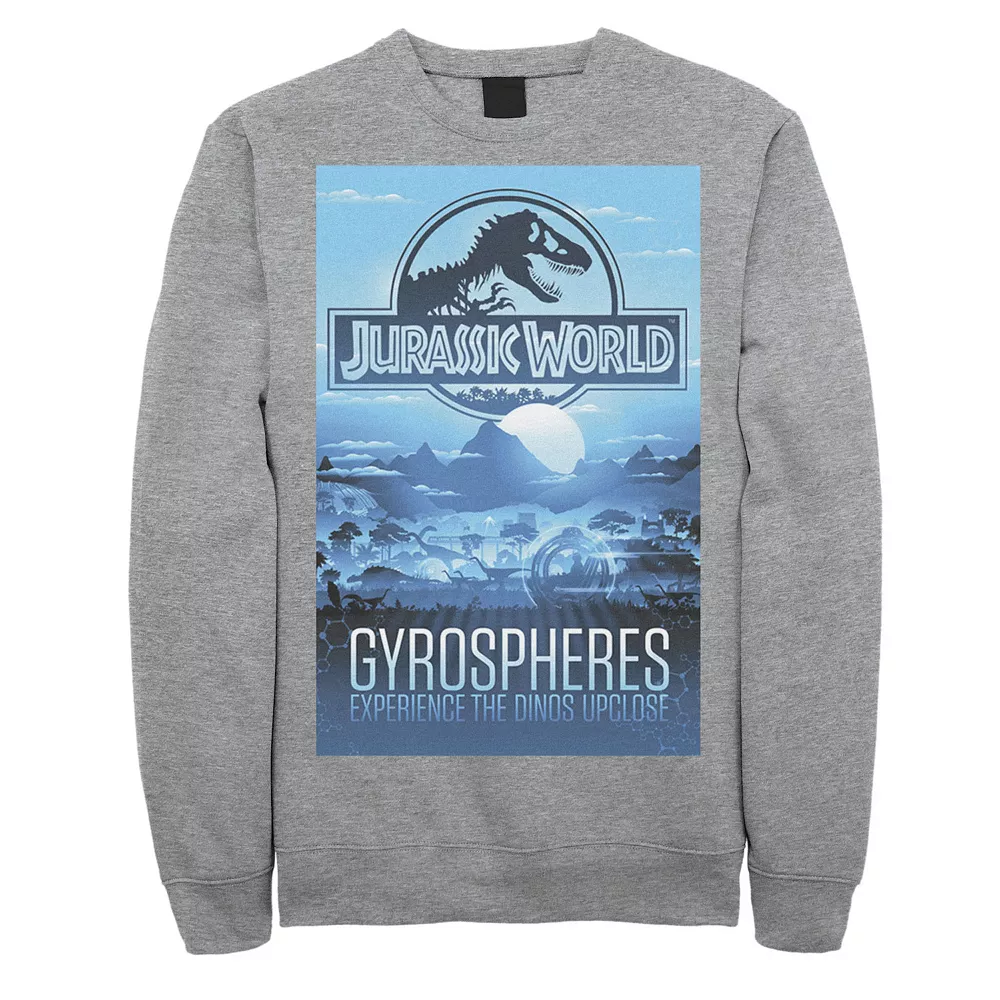 He’ll love wearing this Men’s Jurassic World Gyrospheres Tour Park Poster Graphic Graphic Fleece Pullover Pullover.