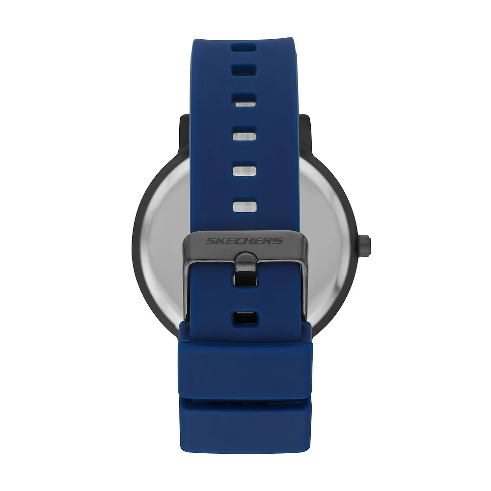 The Skechers Ardmore watch combines fashion and functionality. This sporty watch features a smooth brushed black metal case and blue silicone strap with a 3 hand analog display.
