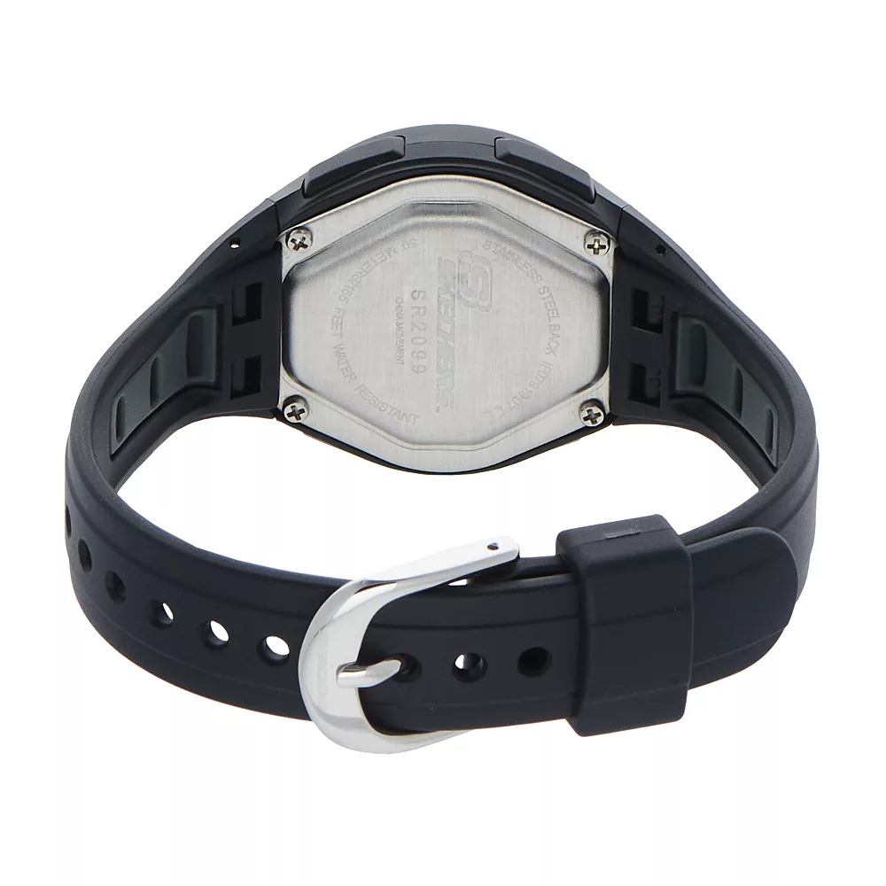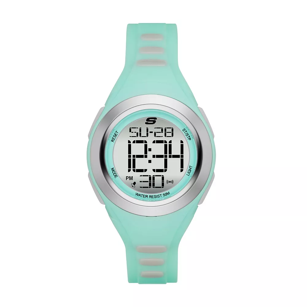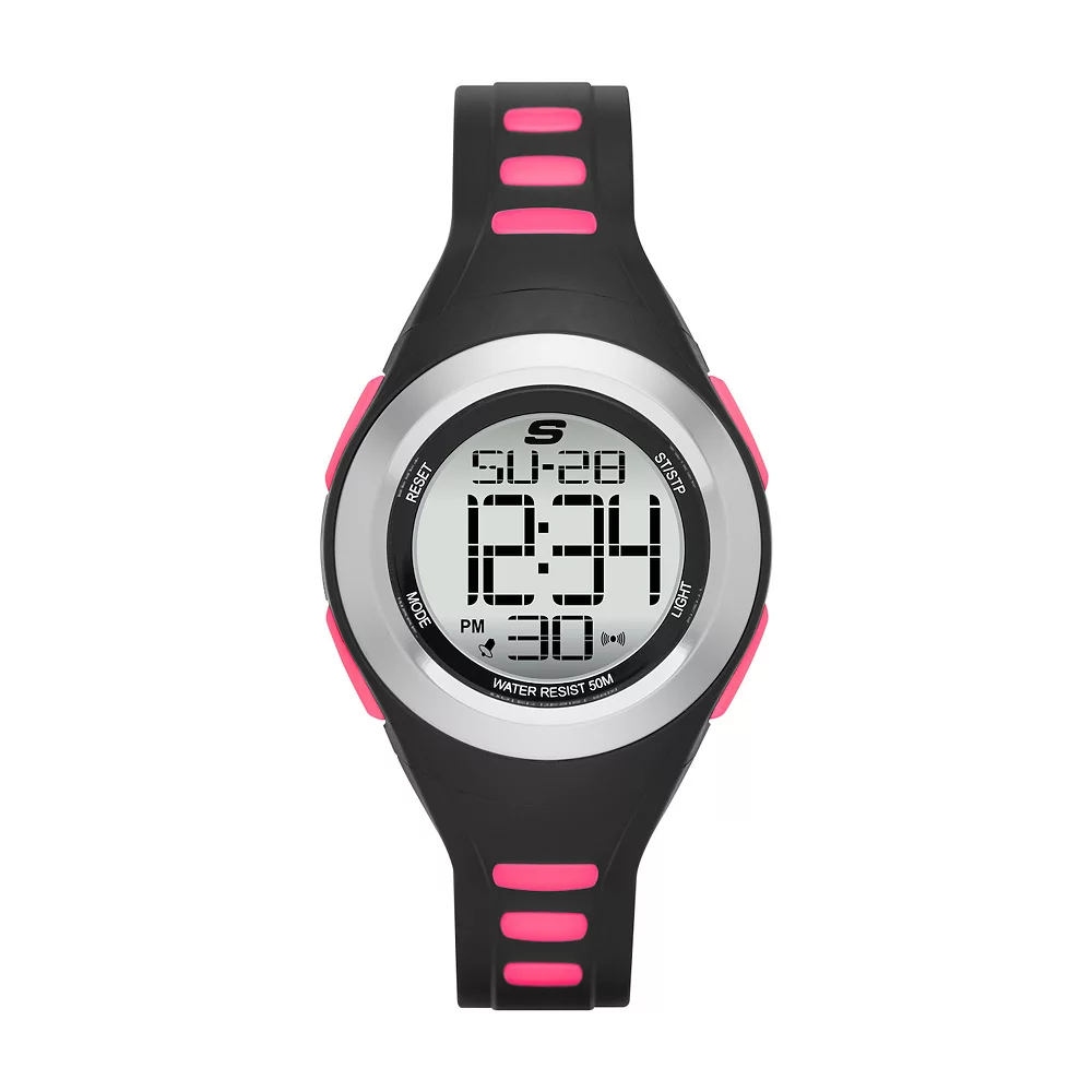 Keep your look sporty and smart with this Skechers Tennyson Watch. It features a silicone strap, metal bezel, and contrasting accents. The positive digital display features a chronograph stopwatch, 12-24 hour and dual time formats, calendar and daily alarm as well as backlight.